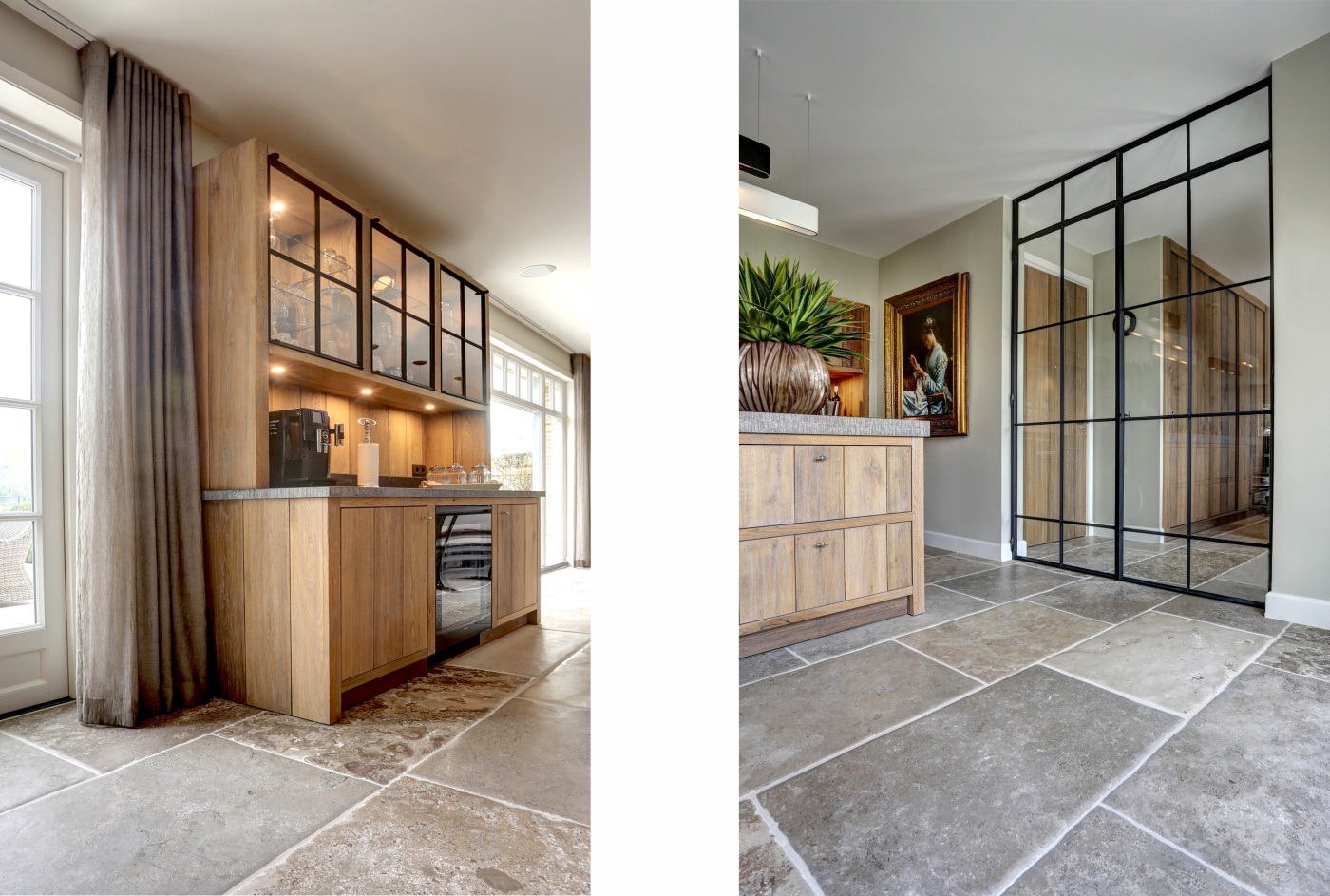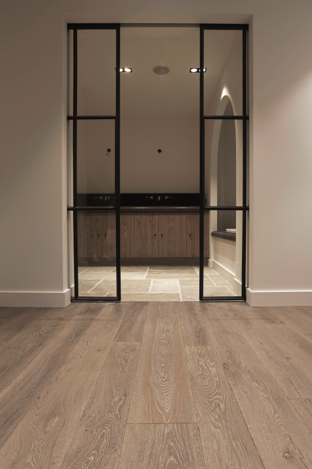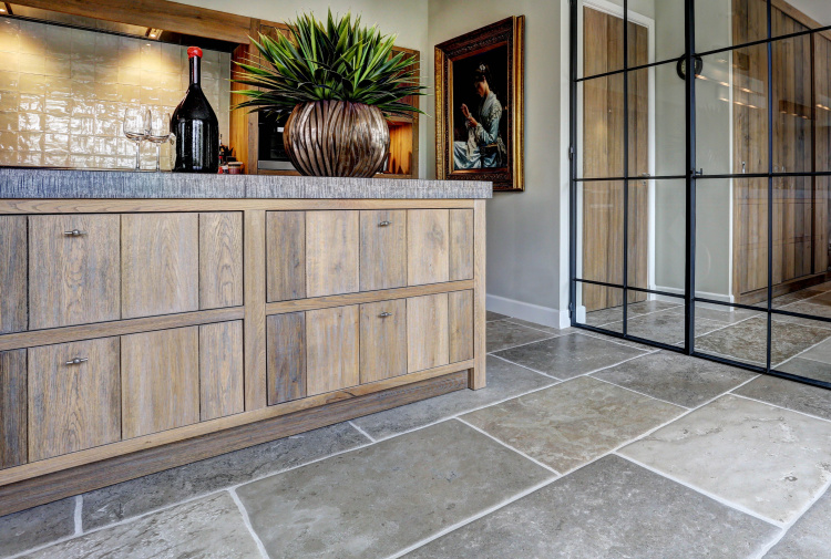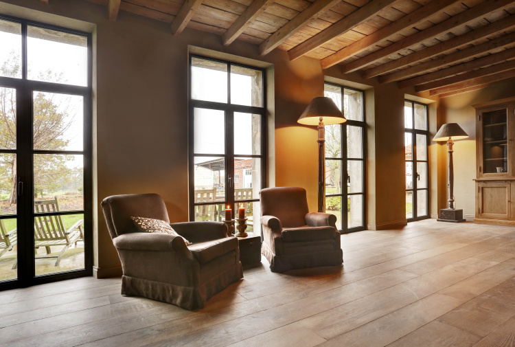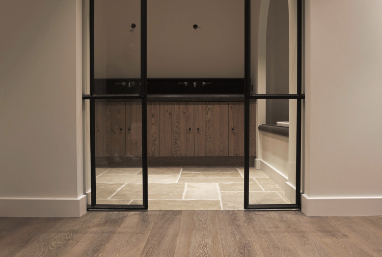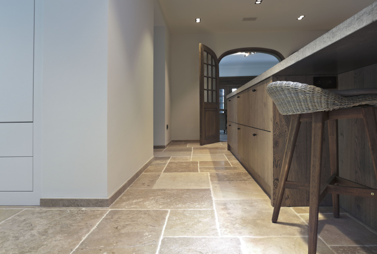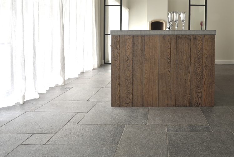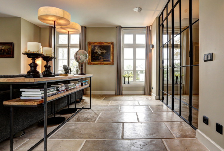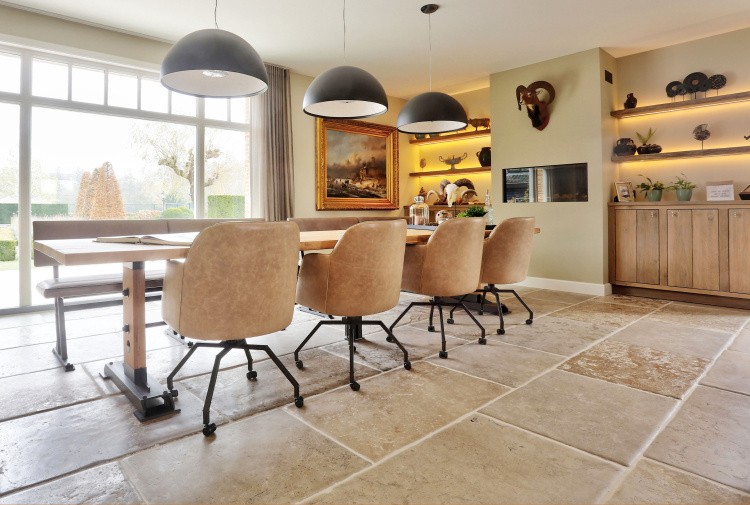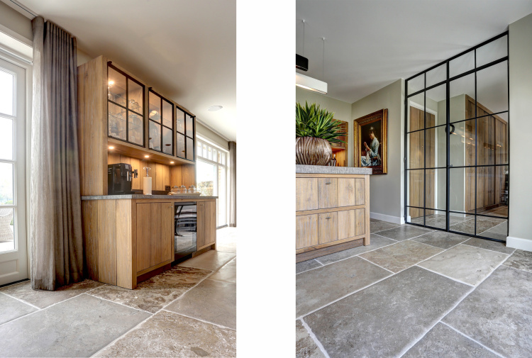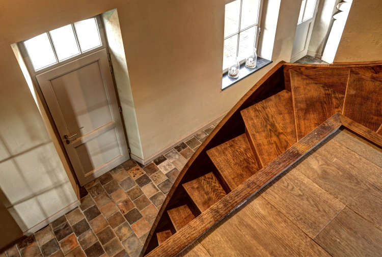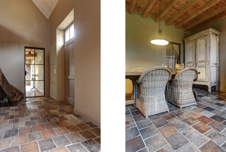 At this authentic farm, we have laid Burgundy Dalles all over the lower level. This floor is very good in combination with the kitchen and interior design. The Burgundian Dalles are also down in the basement. In the bedroom we have laid the authentic wooden planks floor 'Manoir' which also fits well with the Burgundian dales in the hall. A very successful project for us!