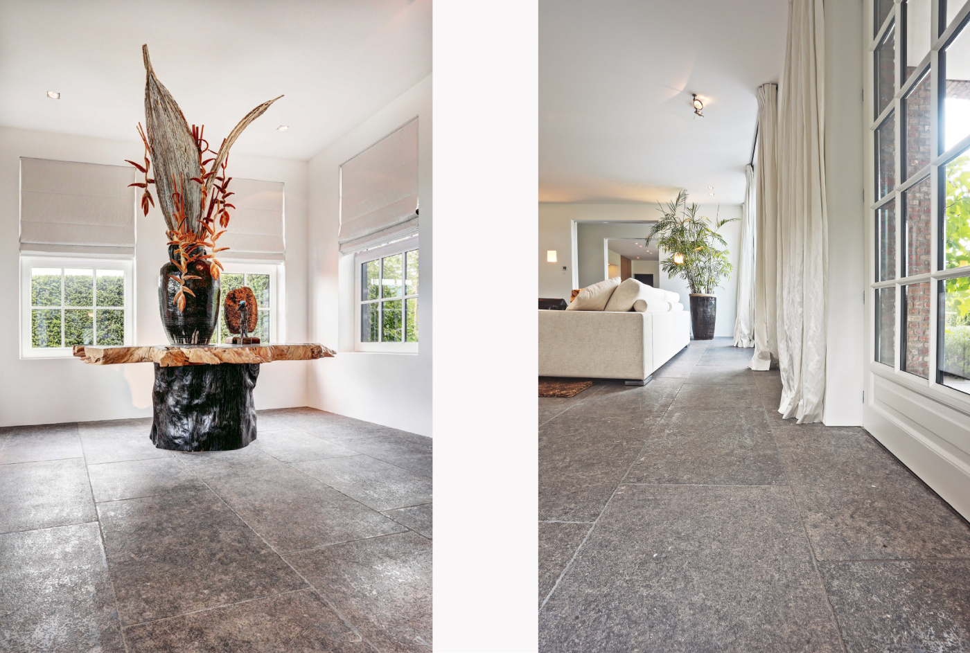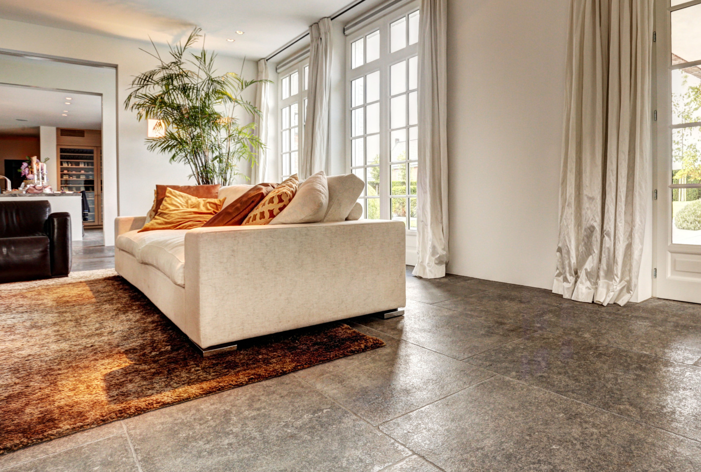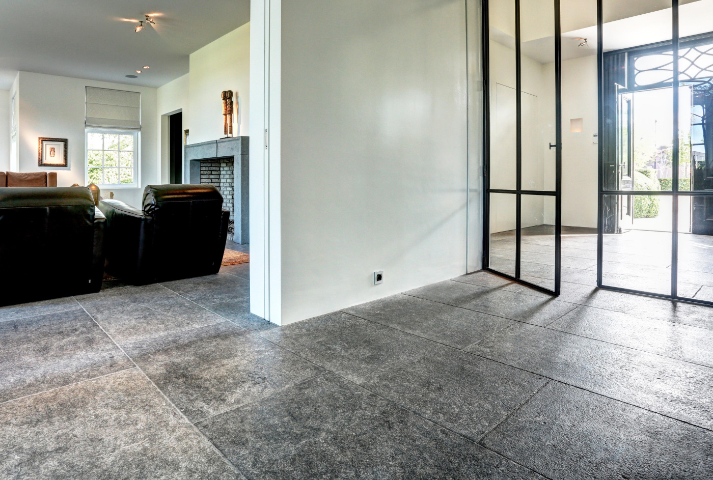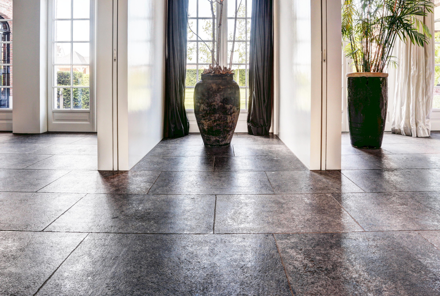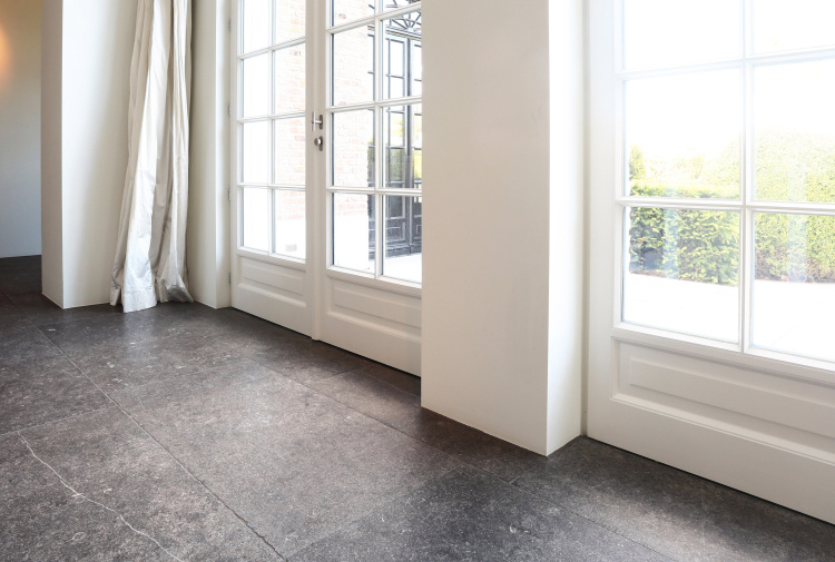 The assignment was to find a beautiful natural stone floor that fits the style of the house. Together we have come out on the older bluestone floor L' Authentique that has been implemented throughout the house and creates a wonderful unity! In addition, we have placed a nice tight blue stone fireplace in the living room that provides both atmosphere and charm.