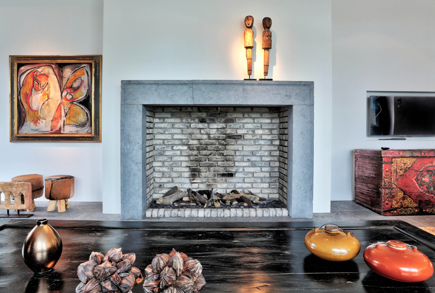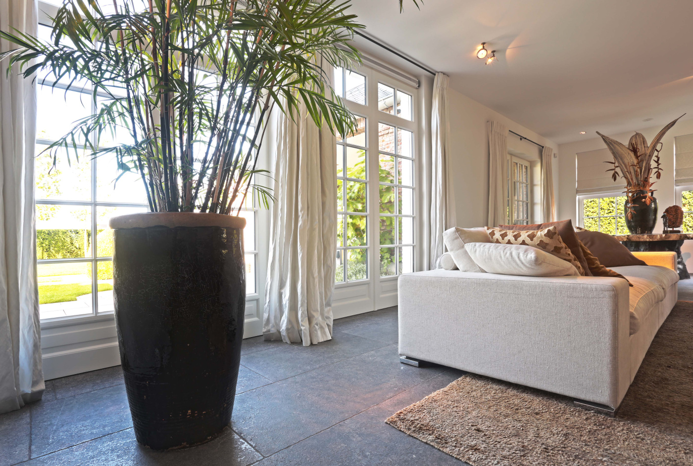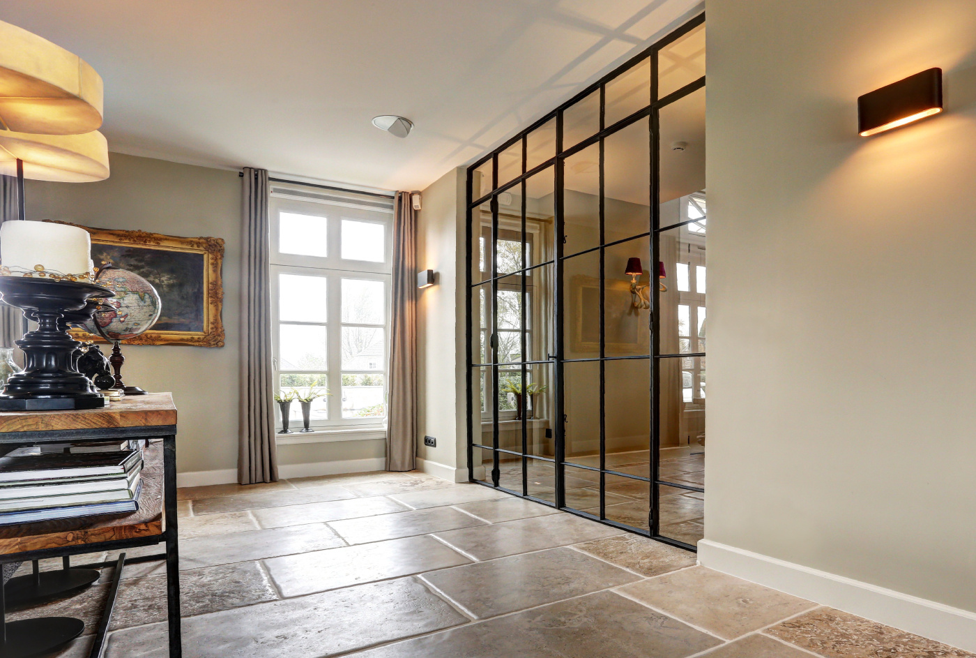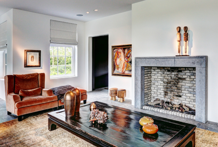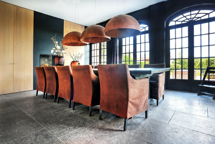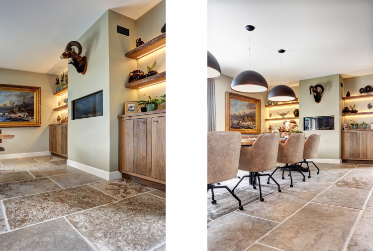 The assignment was to find a beautiful natural stone floor that fits the style of the house. Together we have come out on the older bluestone floor L' Authentique that has been implemented throughout the house and creates a wonderful unity! In addition, we have placed a nice tight blue stone fireplace in the living room that provides both atmosphere and charm.